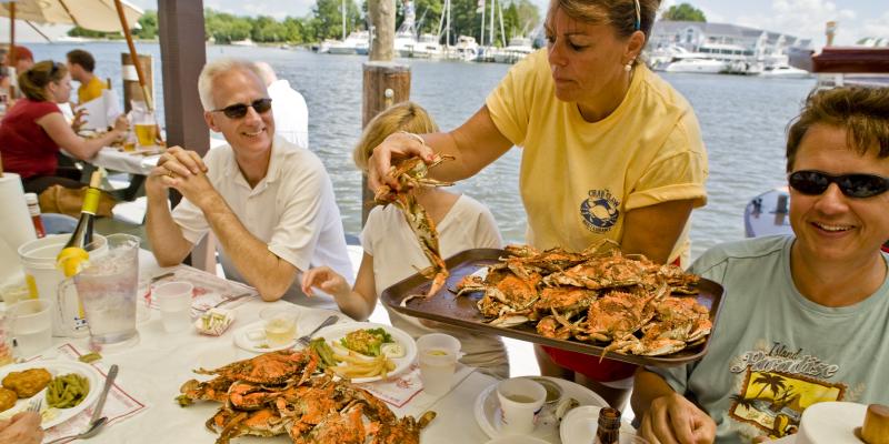 El Restaurante Crab Claw con vista al Puerto de St. Michael ofrece mariscos y vegetales frescos de la zona y es un gran lugar para saborear los famosos picantes y condimentados Cangrejos Azules de Maryland.