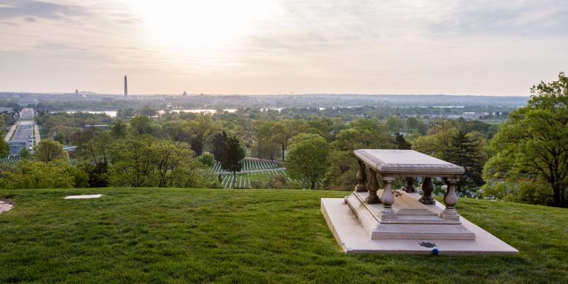 Justo cruzando el río Potomac, en Arlington, Virginia, las verdes colinas del Cementerio Nacional de Arlington son el lugar de descanso eterno para 330 mil patriotas estadounidenses, incluyendo a John F. Kennedy.